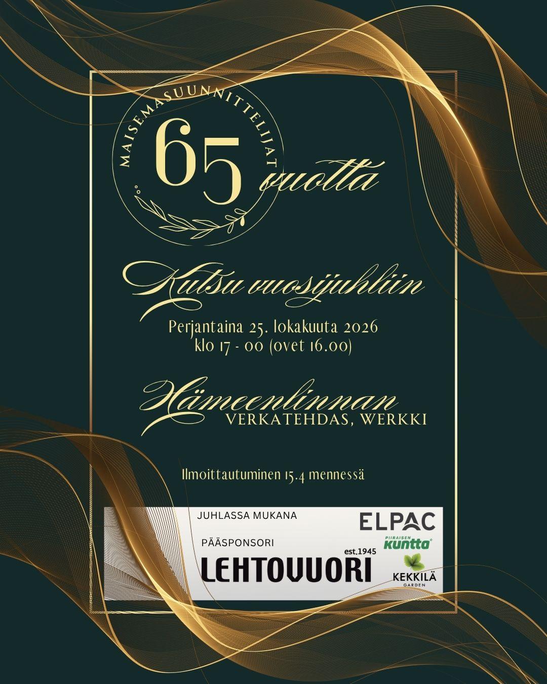 HUOM! UUSI AJANKOHTA 23.10.2026. Maisemasuunnittelijat ry täyttää 65 vuotta ja sitä juhlitaan perjantaina 23.10. Hämeenlinnan Verkatehtaalla uudessa Werkki-tilassa. Ovet avautuvat klo 16.00 Juhla…